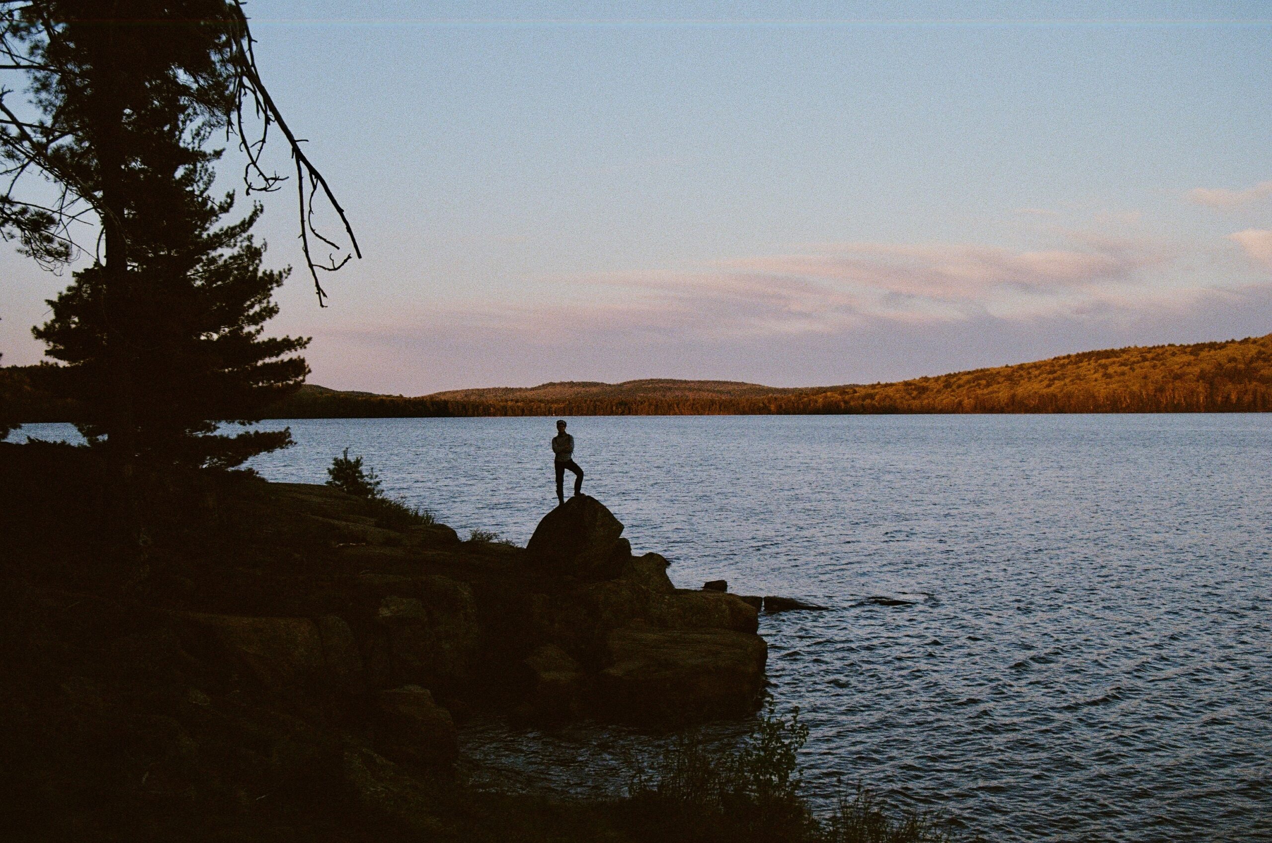 The iconic rocky shoreline peeks out from under the forest cover as a White Pine dips towards the water’s edge. Peck Lake Trail, Algonquin Park.