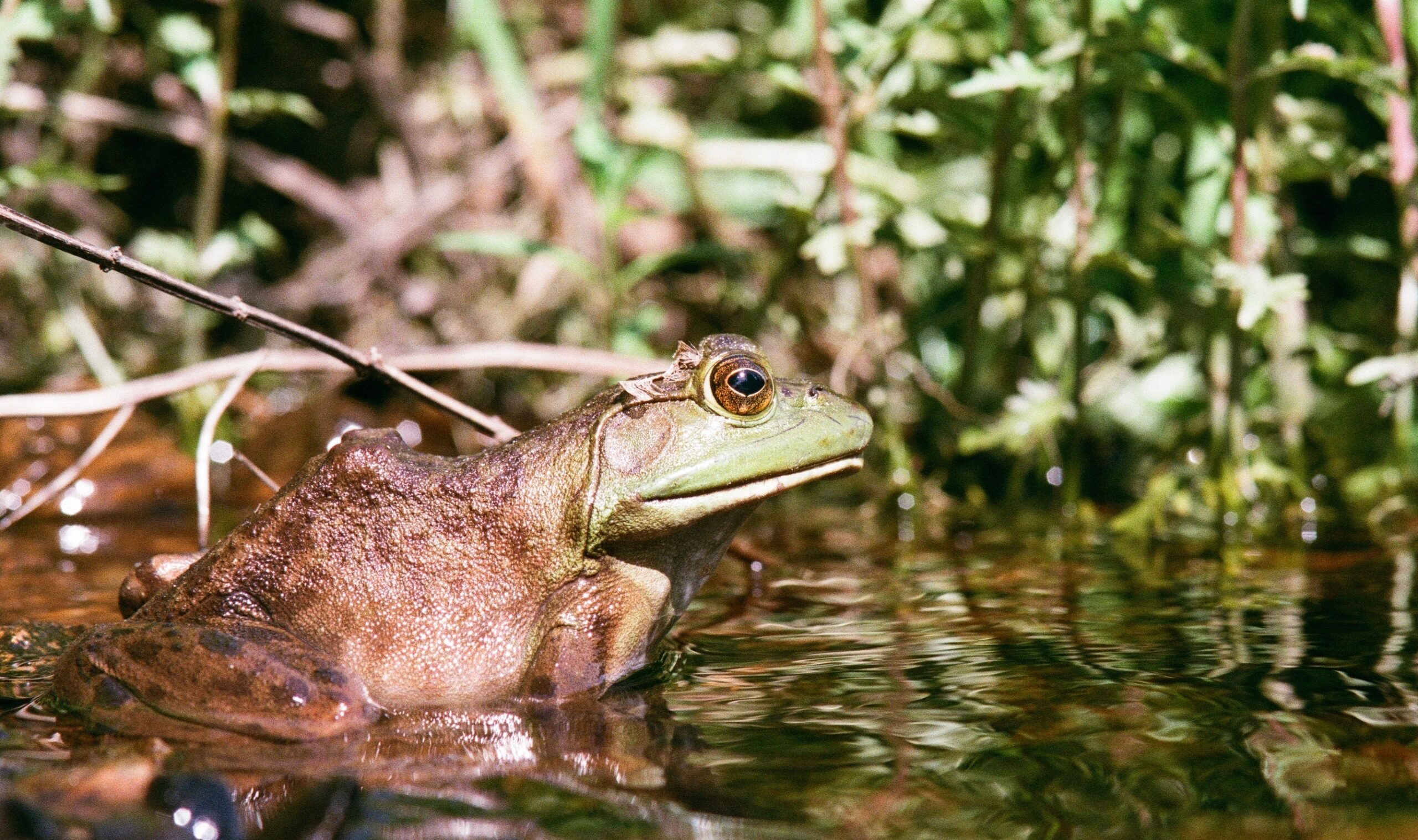 - Portrait of a local resident. A female American Bullfrog sits in the cool waters of a shallow rock pool. Lake Sasajewun, Algonquin Park.
