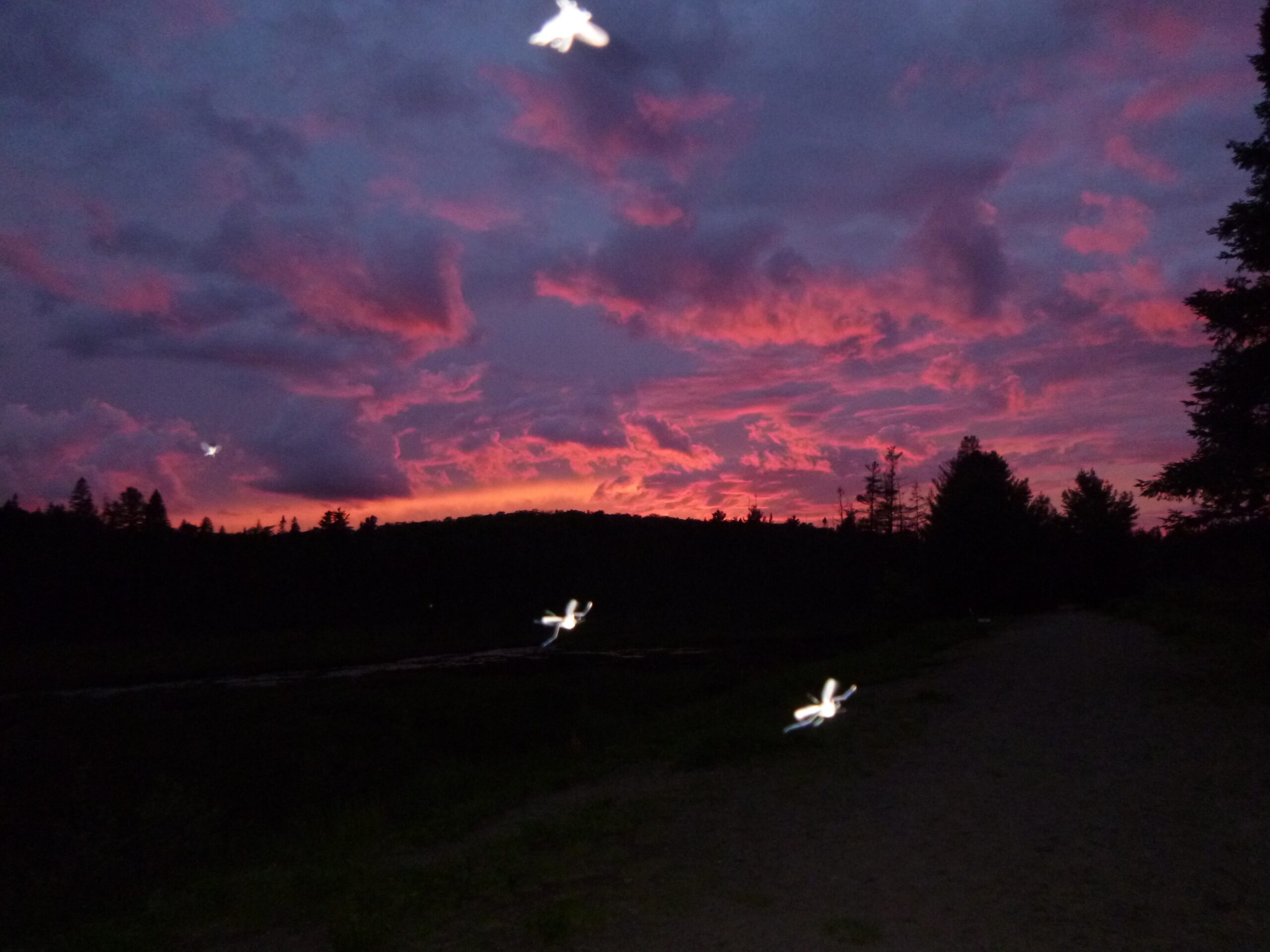- During nightly monitoring duty, myself and some unwelcome guests enjoy the powerful colours the sun produces as it sets on the horizon. West Rose Lake, Algonquin Park.