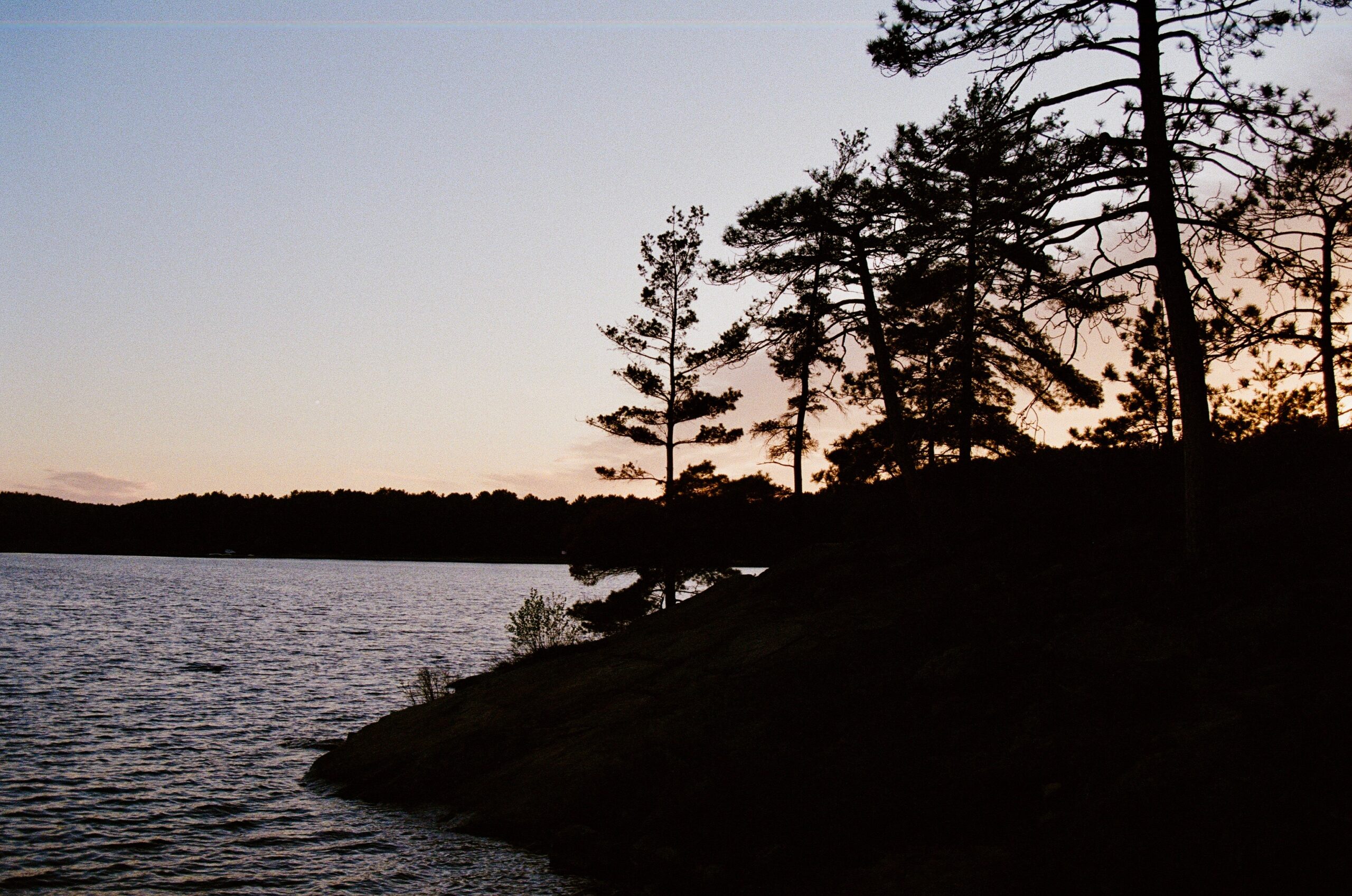 - Trees standout against the sunset backdrop on a nameless lake island. Lake of Two Rivers, Algonquin Park.